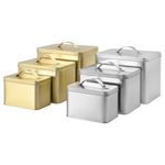Удобно хранить чай, кофе и другие сыпучие продукты. Для экономии места при хранении пустые емкости меньшего размера можно поставить в большие. Размеры: 1 шт. 16x10x13 см (1,7 л), 1 шт. 20x14x17 см (4 л) и 1 шт. 23x17x20,5 см (7 л). Сталь, Лужение.