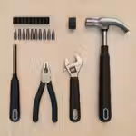 В набор входит: 1 коробка с молотком и отдельным резиновым демпфером, один гаечный ключ, комбинированные плоскогубцы, отвертка, шлицевые биты, звездчатые биты, шестигранные биты и шило.