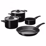 В набор входит: кастрюля с крышкой 3 л и 5 л, сотейник 1 л и и сковорода диам. 28 см.