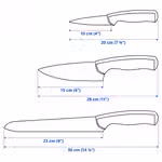 В набор входит: нож для хлеба 23 см (общ. длина 35 см), поварской нож 15 см (общ. длина 28 см) и нож для чистки овощей и фруктов 10 см (общ. длина 20 см).