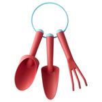 Чтобы садовые инструменты были под рукой, их можно повесить на прилагающееся кольцо. Садовые инструменты изготовлены из прочного пластика, армированного стекловолокном. В набор входит: 3 садовых инструмента – совок, грабли и закругленный совок.