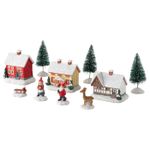 В комплект входит: 1 домик 7,5x8 см, 1 домик 6,5x8 см, 1 домик 6x8,5 см, 2 фигурки Санта-Клауса 5x3 см, 3 елочки 10x3,5 см, 1 фигурка оленя 4,5x3,5 см и 1 сани 2x3,5 см.