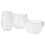 В набор входит: 1 ваза (высота 12 см, диам. 22 см), 1 ваза (высота 18 см, диам. 21 см) и 1 ваза (высота 21 см, диам. 14 см).