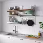 Когда кухонные принадлежности, специи и рецепты размещаются в удобных аксессуарах для хранения на стене, у вас сразу появляется больше места для готовки. С товарами серии КУНГФОРС легко создать индивидуальное решение, чтобы все необходимое было на виду и под рукой, как у профессиональных поваров. Кастрюли — на открытых полках, ножи — на магнитной планке, а кухонные принадлежности — на крючках. Готовьте с удовольствием!