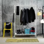 Легко передвигать благодаря колесикам. Два колесика можно заблокировать, чтобы зафиксировать напольную вешалку на месте.На нижнюю полку можно поставить коробки или 4 пары обуви.Рекомендуется использовать только в помещении.