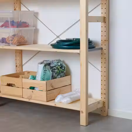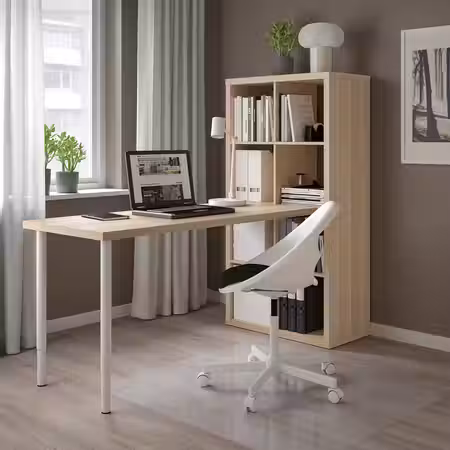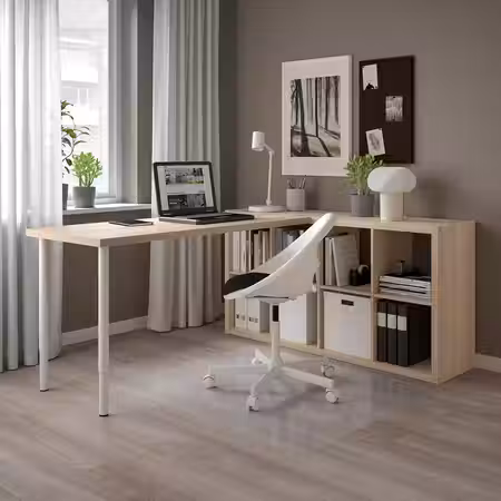 Столешницу и ножки можно прикрепить к стеллажу КАЛЛАКС при помощи фурнитуры ИНЛЭГГ.