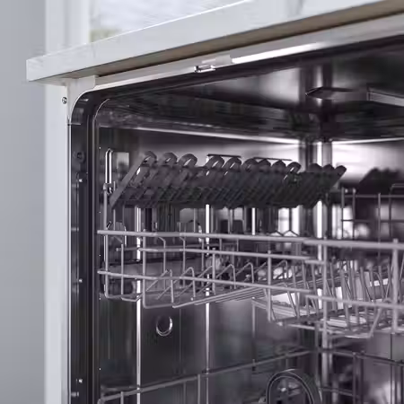 Дополните ее матовыми фасадами УППЛЁВ серо-бежевого цвета со встроенными ручками и скошенными краями, и получится строго очерченный дизайн в современном стиле.