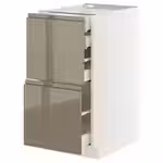 Матовые фасады кухонных шкафов УППЛЁВ бежевого цвета выполнены в утонченном современном стиле и дополнены скошенными краями и встроенными ручками в тон.