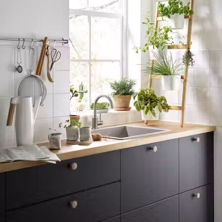 Дополните ее белыми фасадами ВОКСТОРП с глянцевой поверхностью и встроенными ручками, и получится просторная кухня в современном стиле.
