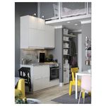 Матовые фасады кухонных шкафов УППЛЁВ бежевого цвета выполнены в утонченном современном стиле и дополнены скошенными краями и встроенными ручками в тон.