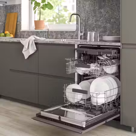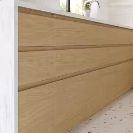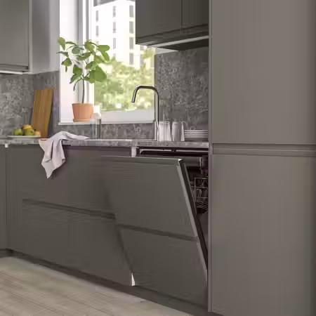 Гладкие фронтальные панели ящиков ВОКСТОРП с интегрированными ручками придадут интерьеру кухни лаконичный современный облик.