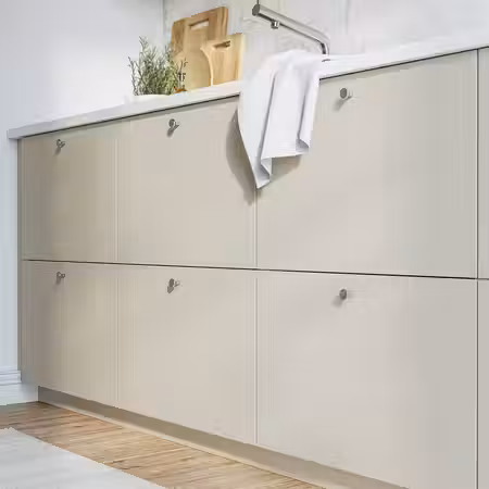 Гладкий бежевый фасад ХАВСТОРП с четкими линиями придает кухне спокойный и гармоничный облик.