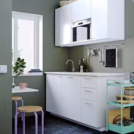 Дополните стеклянными дверцами ЭНЧЁПИНГ с отделкой белой пленкой, чтобы подчеркнуть классический и теплый стиль вашей кухни.
