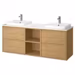 В комплект входит: 2 шкафа под раковину с ящиками, 1 открытый шкаф, 1 столешница, 2 полуутопленные раковины, 2 сифона и 2 смесителя.