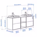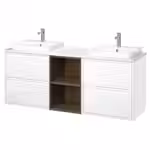 В комплект входит: 2 шкафа под раковину с ящиками, 1 открытый шкаф, 1 столешница, 2 полуутопленные раковины, 2 сифона и 2 смесителя.