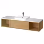В этой комбинации с одним выдвижным ящиком и двумя открытыми полками идеально сочетаются открытое и закрытое хранение, стильная полуутопленная раковина и столешница, на которой остаётся много свободного места.