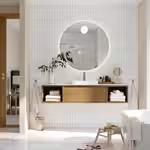 Это решение с раковиной в центре, одним выдвижным ящиком и открытыми шкафами по бокам визуально увеличивает пространство благодаря навесному способу установки и наполняет комнату уютом за счёт отделки из тёплого дерева.
