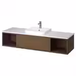 В этой комбинации с одним выдвижным ящиком и двумя открытыми полками идеально сочетаются открытое и закрытое хранение, стильная полуутопленная раковина и столешница, на которой остаётся много свободного места.