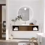 Это решение с раковиной в центре, одним выдвижным ящиком и открытыми шкафами по бокам визуально увеличивает пространство благодаря навесному способу установки и наполняет комнату уютом за счёт отделки из тёплого дерева.