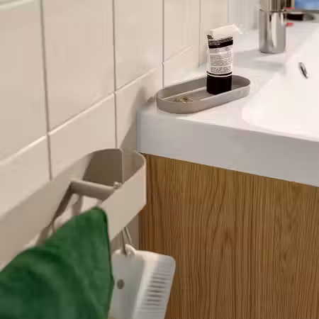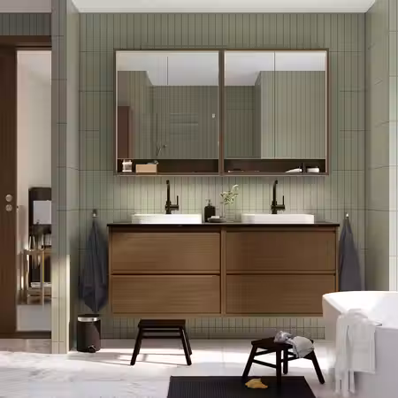 Мебель для ванной ЭНГШЁН выглядит современно и лаконично с минимумом деталей.