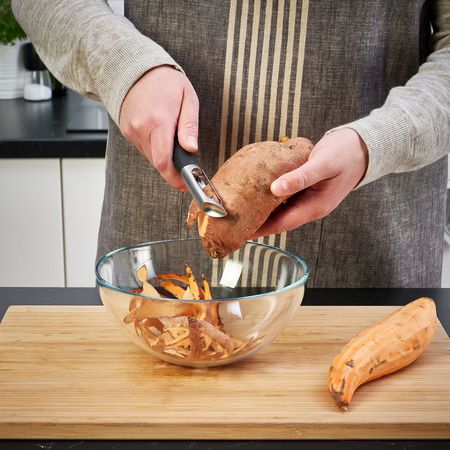 Используйте острый край для удаления картофельных глазков. Длина: 19 см. Пластмасса АБС, Нержавеющая сталь. Не содержит Бисфенол А.