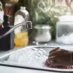 Высокий носик черного кухонного смесителя ДЕЛЬШЁН позволяет без труда мыть большие предметы, такие как кастрюли.