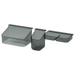В набор входит: 1 лоток, (15,5x 9,2x 2,5 см), 1 держатель для бутылки (16,4x 11,4x 8,8 см) и 1 держатель для зубных щеток (7x 8,4x 11,5 см).