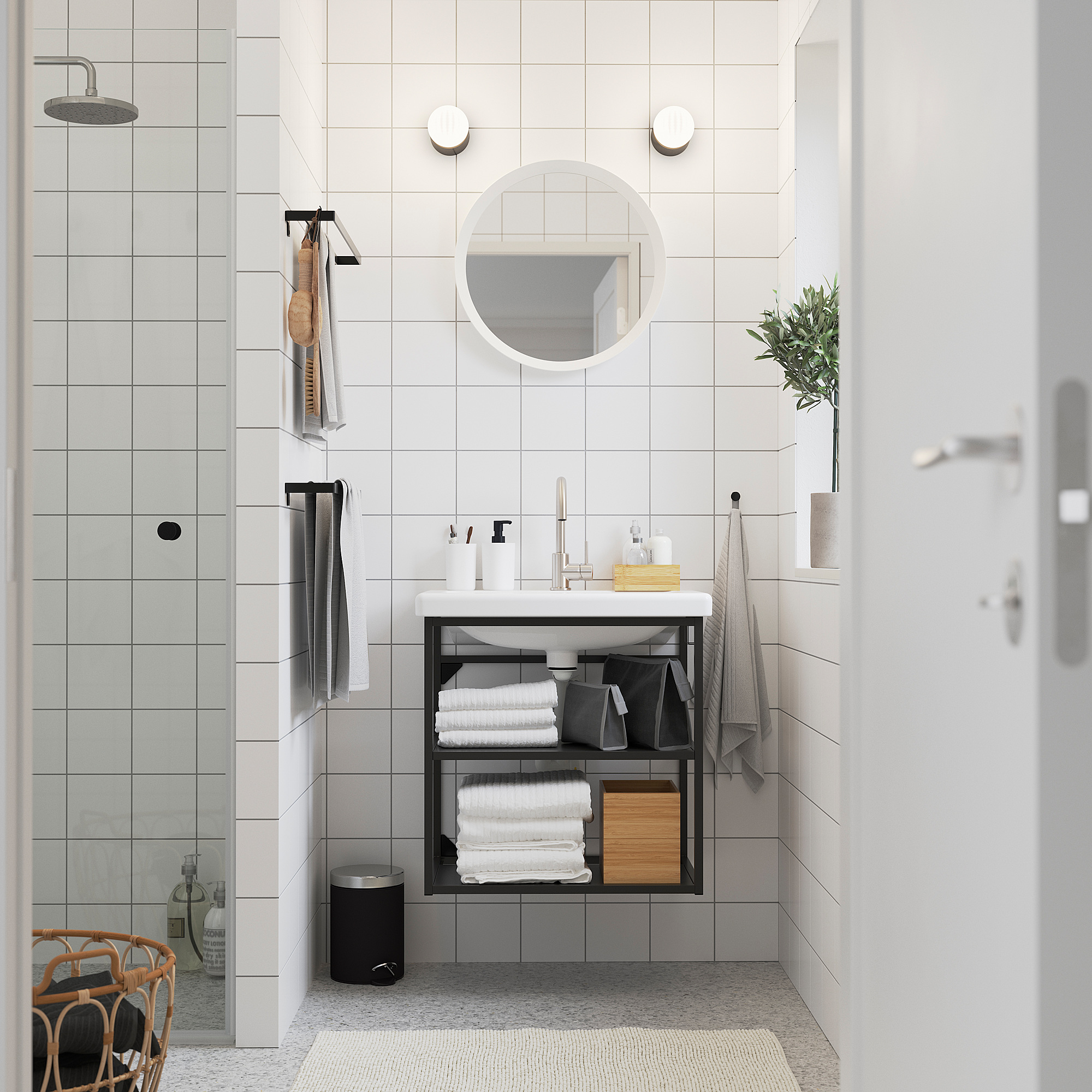 Серия ЭНХЕТ позволяет с легкостью создавать комбинации мебели, чтобы начать в ванной новую жизнь. Это решение идеально подходит для любителей лаконичности и минимализма. Цвет каркаса можно выбрать на ваш вкус.