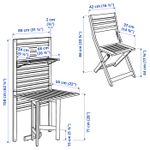 В комбинацию входит: настенная панель/стол (ширина 80 см, глубина 62 см, высота 158 см); стул (ширина 45 см, глубина 58 см, высота 87 см, ширина сиденья 40 см, глубина сиденья 41 см, высота сиденья 44 см).