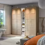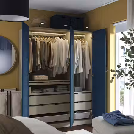 В гардеробе ПАКС вы сможете хранить много вещей на малой площади. Здесь есть платяные штанги для короткой и длинной одежды на плечиках, вентилируемые корзины, а также ящики и выдвижные полки, пространство которых можно оптимизировать с помощью