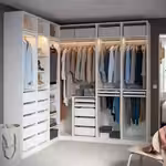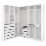 В этом большом угловом решении хватит места, чтобы повесить одежду и аккуратно разложить ее по ящикам и полкам.