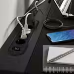 Провода можно убрать в отделение стола с крышкой и провести под столом в лоток для размещения проводов.