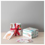 Можно написать поздравление или просто имя того, кому предназначен подарок. В набор входит: 2 рулона упаковочной бумаги (длина 1 м, ширина 0,3 м), 6 этикеток (высота 9,5 см и ширина 6 см). Бумага. Для отбеливания не использовался хлор.