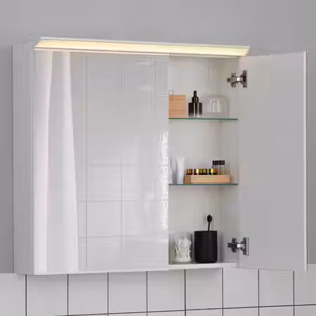 Этот зеркальный шкафчик позволяет задействовать пространство на стене, чтобы организовать туалетные принадлежности и иметь всё необходимое под рукой.