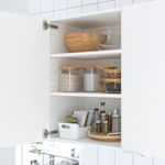Стильное двухуровневое решение для хранения поможет освободить столешницу и по максимуму задействовать пространство в углу, чтобы поставить там разные баночки, бутылочки и мельницы для специй.