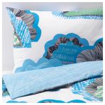 «Когда я начинала работу над дизайном текстиля ДОФТРЭНКА, в мыслях я уже видела яркие крупные рисунки, выполненные в разных техниках и как бы наложенные друг на друга. Я вспоминала легкие облака, похожие на сахарную вату, как в детстве, и сверкающую поверхность моря. И все это – на фоне синего неба. Так у меня постепенно оформился нужный орнамент, который я сначала вырезала из цветной бумаги и тканей. Надеюсь, текстильные товары этой серии будут напоминать вам о ленивом летнем отдыхе – или о ярких зимних днях».