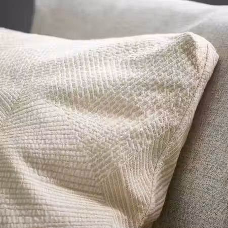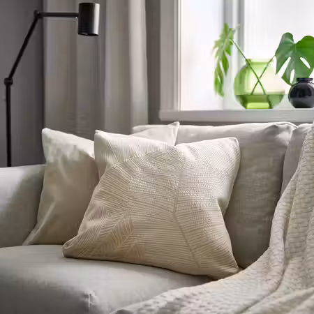 Бежевый чехол на подушку ЭТТЕГРАН украшен вдохновленным природой орнаментом, напоминающим листья под микроскопом.