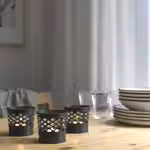 Свет свечи проходит через прорези в металле, создавая декоративные орнаменты и уютную атмосферу.
