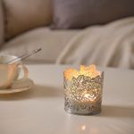 Теплый свет свечи красиво проходит через орнаментальную поверхность подсвечника.