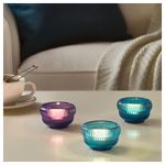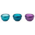 Цветное стекло отражает и усиливает мягкое мерцание свечи. А яркие цвета придадут праздничное настроение любому интерьеру. Высота: 5 см. Диаметр: 8 см. Количество в упаковке: 3 шт. Стекло, Прозрачный лак с оттенком.