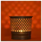 Свет свечи проходит через прорези в металле, создавая декоративные орнаменты и уютную атмосферу.