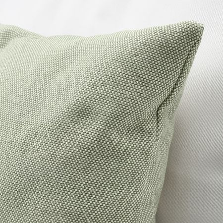 Плотная ткань, частично изготовленная из переработанного хлопка, имеет тактильную фактуру, которая придает этой серо-зеленой подушке особую выразительность.