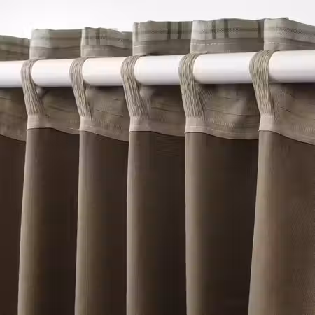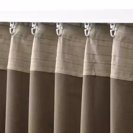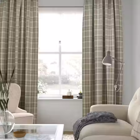 Затемняющие комнату гардины ХЭГГВЕККМАЛ из ткани, которая выглядит как шерстяная, с классическим узором в бежевую клетку и подходящей подкладкой создают ощущение уединения.