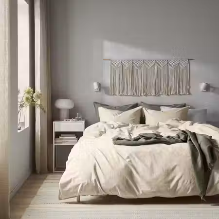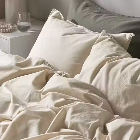 Простыни и наволочки РЁННВЕККМАЛ из высококачественного хлопкового перкаля на ощупь кажутся прохладными.