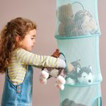 Отличное решение для хранения детских вещей и игрушек в детской, холле или ванной. Можно закрепить на платяной штанге в гардеробе или на отдельно стоящей платяной штанге.Через сетку хорошо видно содержимое.