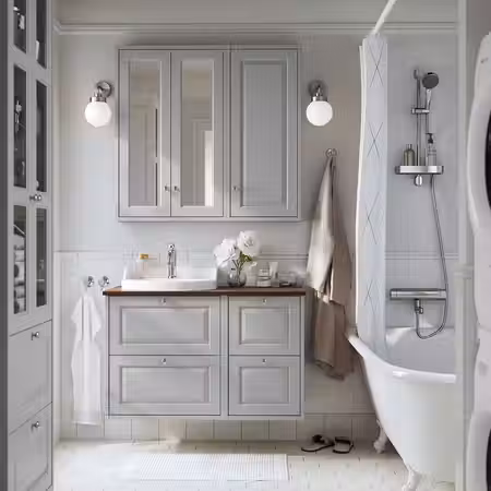 Лучшее решение, если вы любите, чтобы вещи лежали на своих местах и были скрыты от глаз. Здесь четыре выдвижных ящика двух разных размеров, в которые поместятся все предметы личной гигиены. А на столешницу можно положить всё