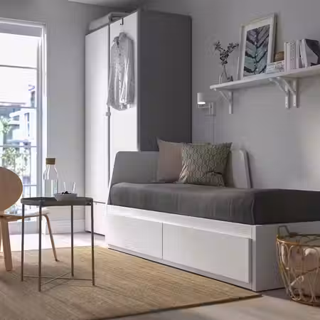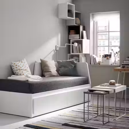 Днем на кушетке удобно сидеть, а ночью она легко превратится в односпальную или двуспальную кровать.