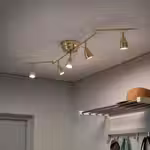 Стильный потолочный светильник с никелированным каркасом и абажуром из белого стекла — направляйте свет туда, где он вам больше всего необходим. Каждый из 5 софитов регулируется по отдельности. Одинаково хорошо смотрится как в прихожей, так и