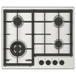Газовая варочная панель из нержавеющей стали с электроподжигом, который включается поворотом ручки.