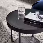 Продуманный дизайн и сочетание разных материалов — столешница из закаленного стекла, ножки из стали с порошковым покрытием и основание под мрамор — придают столику особенно выразительный характер.